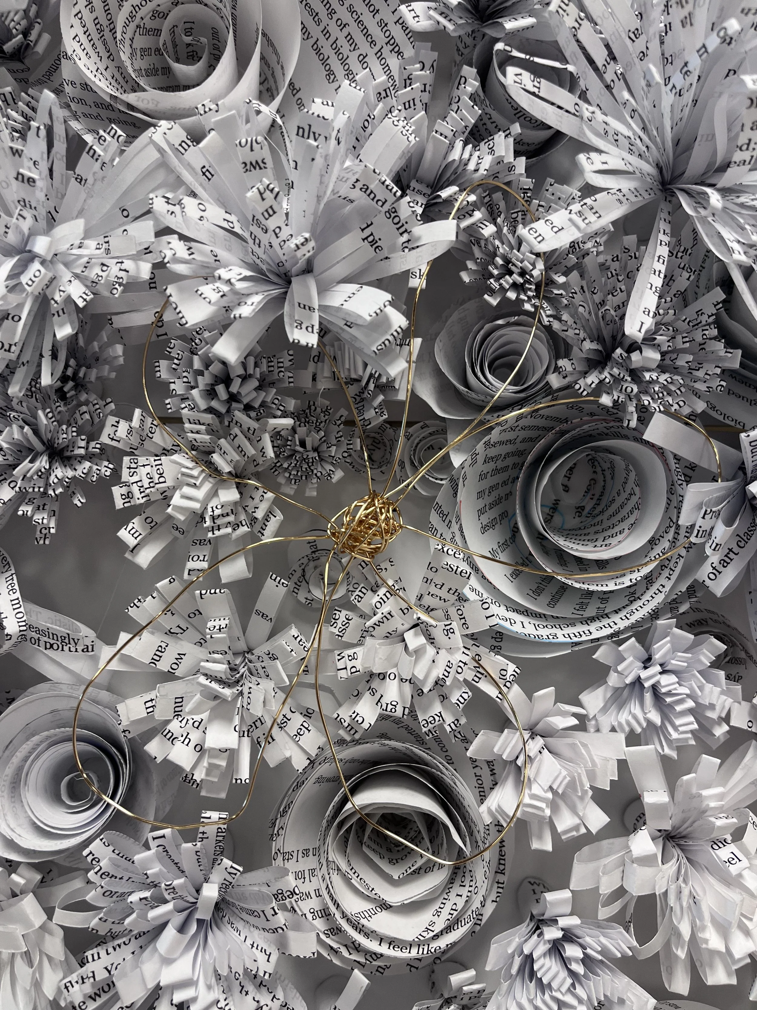 Before I even began, I knew this project was going to take an excessive amount of time. I spent at least two hours everyday making each flower by hand out of printed copies of my manifesto. Once I had a good amount made, I started to glue the flowers to the large foam board. I had previously mapped out where each of the ten metal flowers would be and attached the paper flowers around them. I rolled hundreds of flowers until it was completely filled and the metal flowers I sculpted could be put through the board. Each of the metal flowers had a stem that went through the board and would then connect to a piece of copper tape. I mapped the copper tape all around the back of the board so that it would not overlap with another and end up at its corresponding electrode on the Bare Conductive Touchboard. The touchboard contained ten audio recordings of prominent lines of my manifesto. Therefore, when a wire flower is touched, a corresponding line is played from a speaker or headphones that the user is wearing.